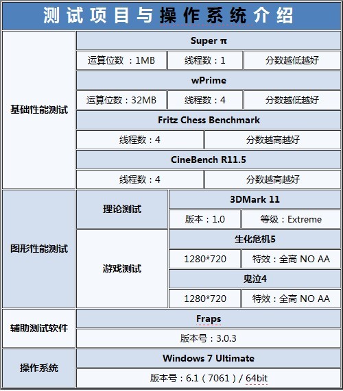 測試環(huán)節(jié)中,我們使用Superπ、wPrime以及Fritz Chess Benchmark來測試平臺的計(jì)算性能。在Cinebench中我們著重測試平臺的的圖形渲染能力。在圖形理論測試中,我們選用3DMark 11/Extreme模式來測試性能。最后,筆者選擇了《生化危機(jī)5》和《鬼泣4》兩款游戲作為游戲測試的項(xiàng)目,分辨率為1280*720,效果全高,NO AA。測試結(jié)果如下: