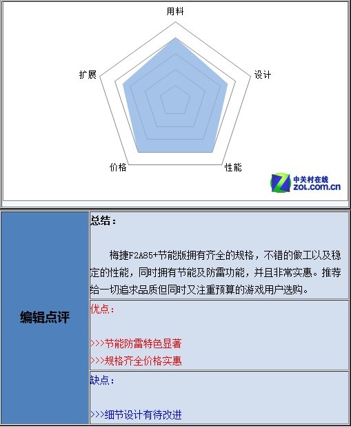 梅捷F2A85+節(jié)能版擁有齊全的規(guī)格,不錯(cuò)的做工以及穩(wěn)定的性能,同時(shí)擁有節(jié)能及防雷功能,并且非常實(shí)惠。推薦給一切追求品質(zhì)但同時(shí)又注重預(yù)算的游戲用戶選購。