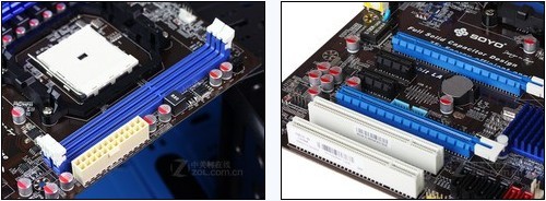 主板的內(nèi)存部分,帶有2條DDR 3插槽,最大支持1866MHz雙通道內(nèi)存組合。PCI擴(kuò)展方面,提供了2條PCI-E x16高速插槽,2條PCI-E x1插槽,2條PCI插槽,1條mini PCI-E插槽,齊全的擴(kuò)展插槽極大的方便了用戶對(duì)平臺(tái)的性能進(jìn)行擴(kuò)展。