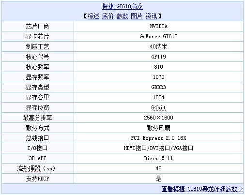 顯卡,這款顯卡標配了2G顯存。目前該款顯卡已經(jīng)到貨長春,經(jīng)銷商“長春藍?萍”報價僅售399元,有需要的用戶可直接前往購買。梅捷GT610浩龍顯卡采用40nm工藝制程的GF119顯示核心,顯卡核心內(nèi)建48個CUDA核心、8個紋理單元和4個光柵單元。顯卡支持DX11、CUDA及PhysX等技術(shù),同時支持3DVision中的照片、電影和藍光,并集高清視頻解碼加速與后期處理于一身。