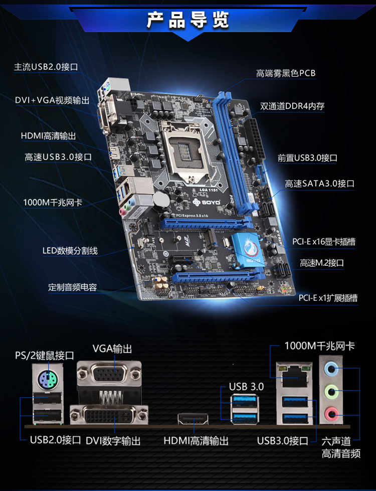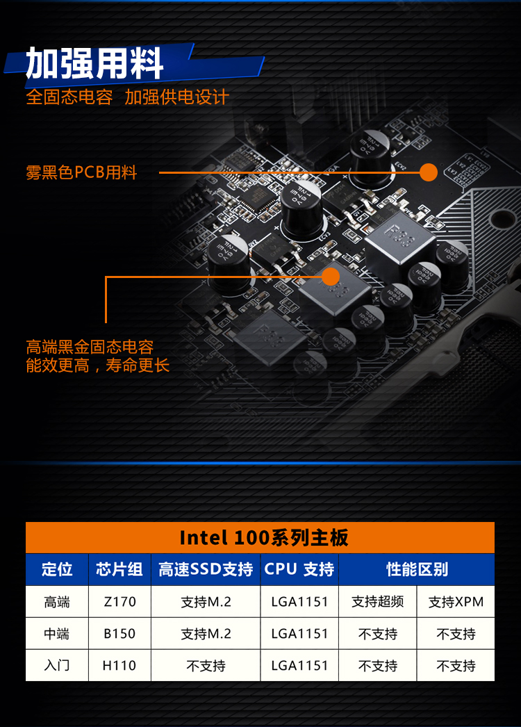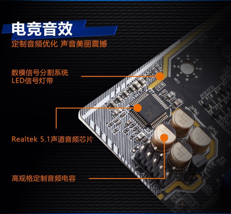 旗艦芯片,中空散熱片,雙顯卡插槽,帶M.2接口,數(shù)模分割線,音頻電容