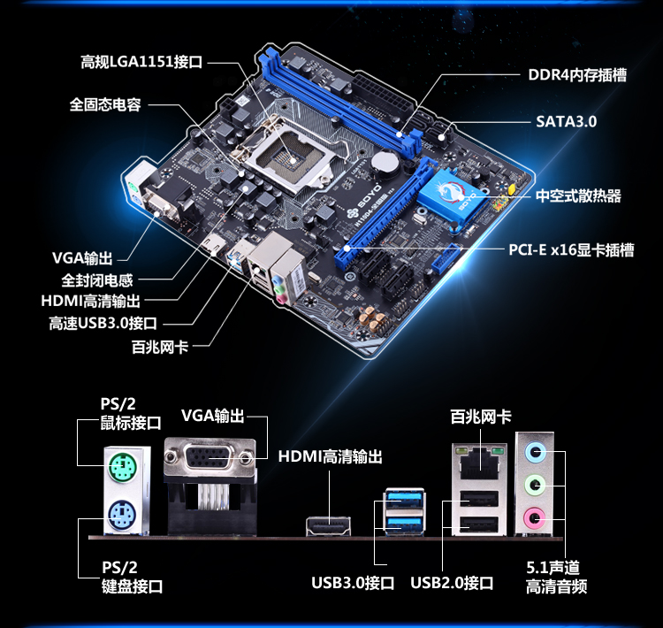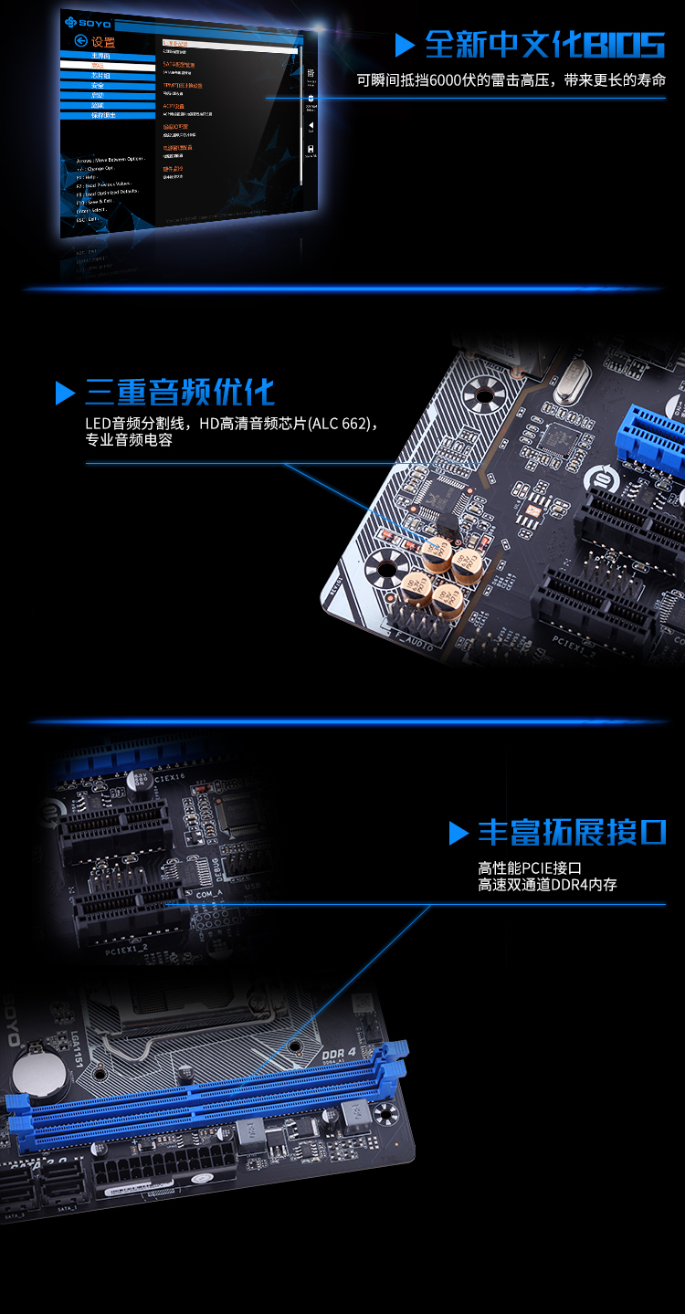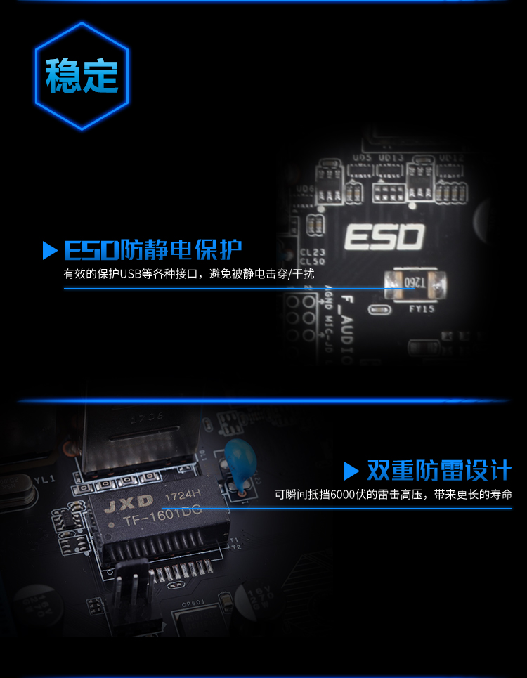 扎實供電,DDR4內(nèi)存,音頻分割線,音頻電容,SATA3.0,USB3.0