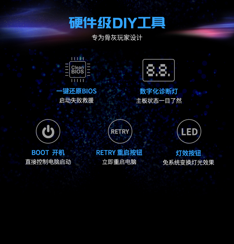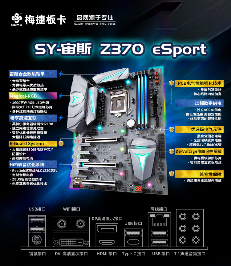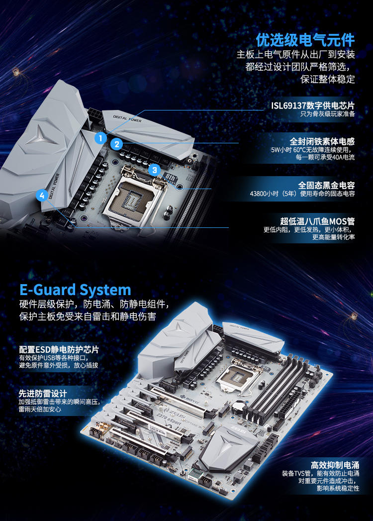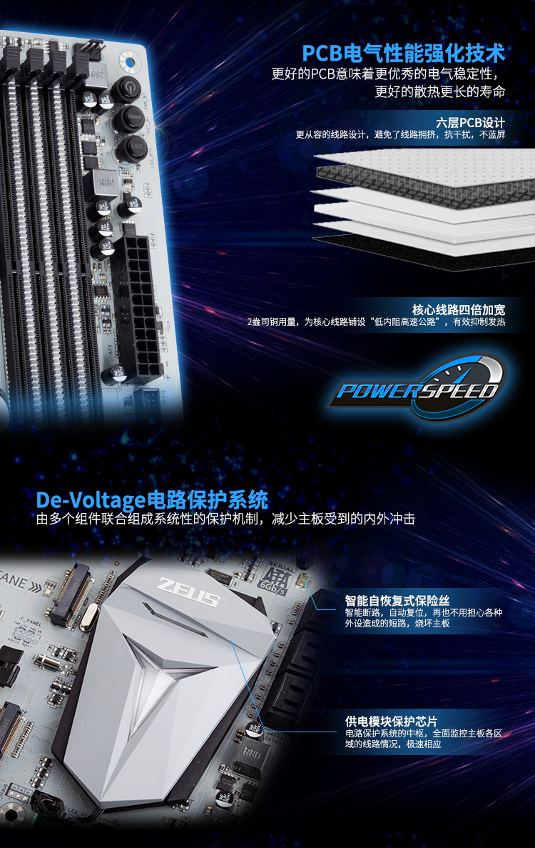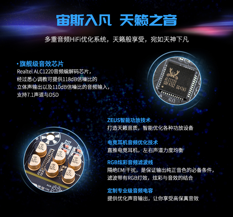 雷神盾防護系統(tǒng)、15相數(shù)字供電優(yōu)化、Magical-RGB 1600萬色燈效,演繹電競美學(xué)、服務(wù)器極速網(wǎng)卡、HiFi旗艦音頻優(yōu)化系統(tǒng)、未來設(shè)計感宙斯散熱鎧甲