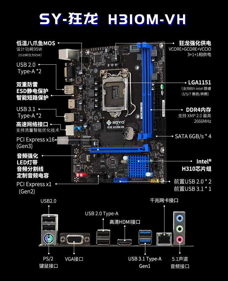 - 扎實(shí)供電,DDR4內(nèi)存,音頻分割線,音頻電容,SATA3.0,USB3.1