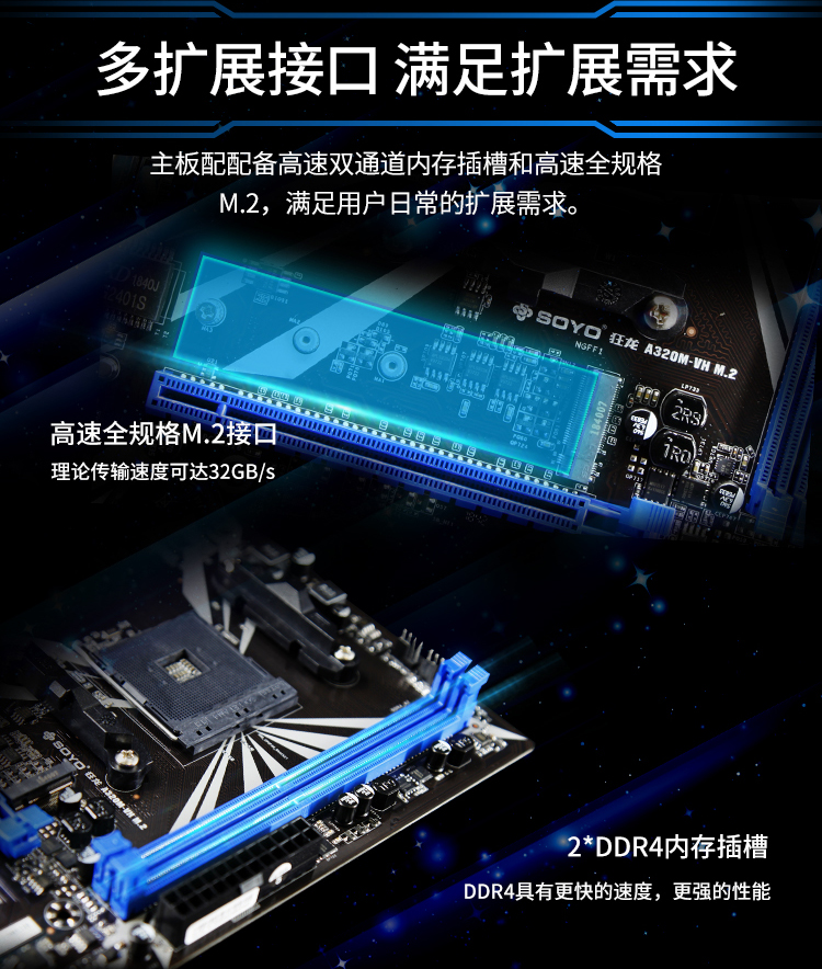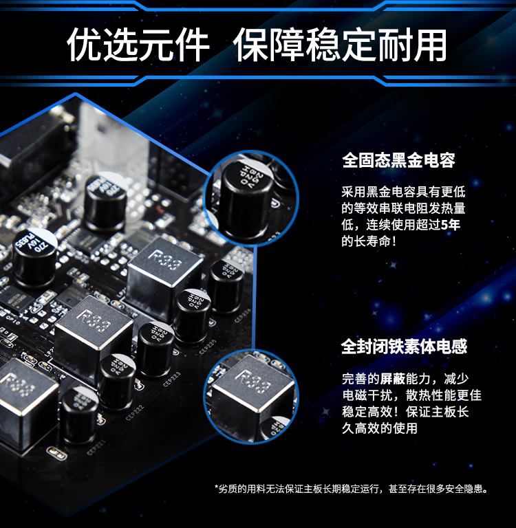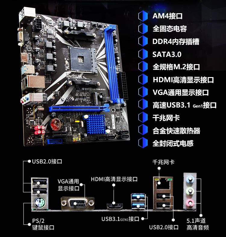 - 1x M.2高速接口,1顯卡插槽,2條DDR4內(nèi)存槽,五重音頻優(yōu)化,五相供電,整版ESD防護(hù),中空散熱片