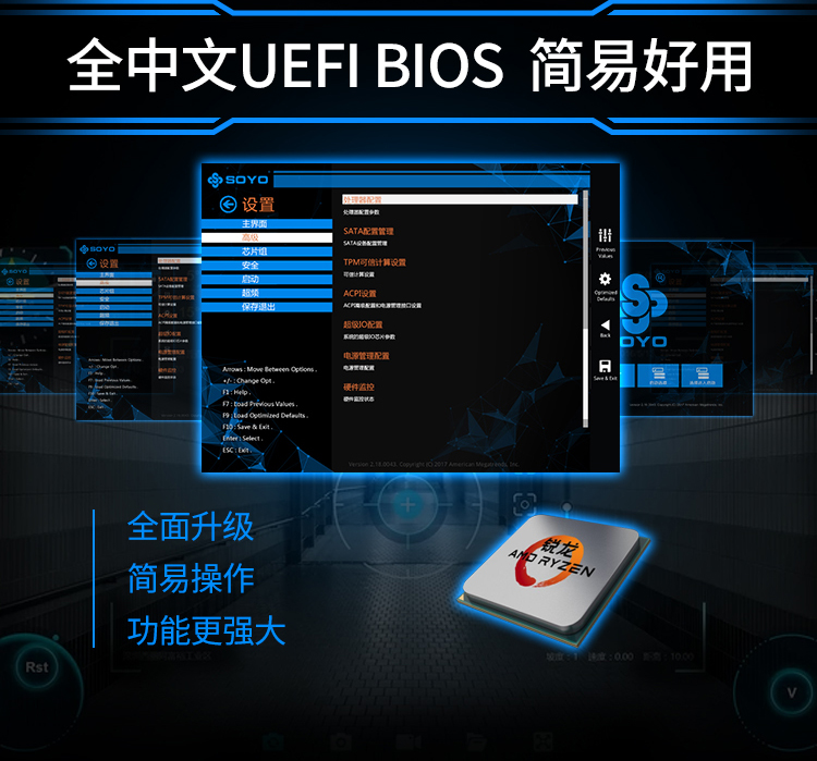 - 支持 AMD AM4 插槽 A 系列 APU (Bristol Ridge) 與銳龍 AMD Ryzen 處理器 (Summit Ridge) (Raven Ridge)