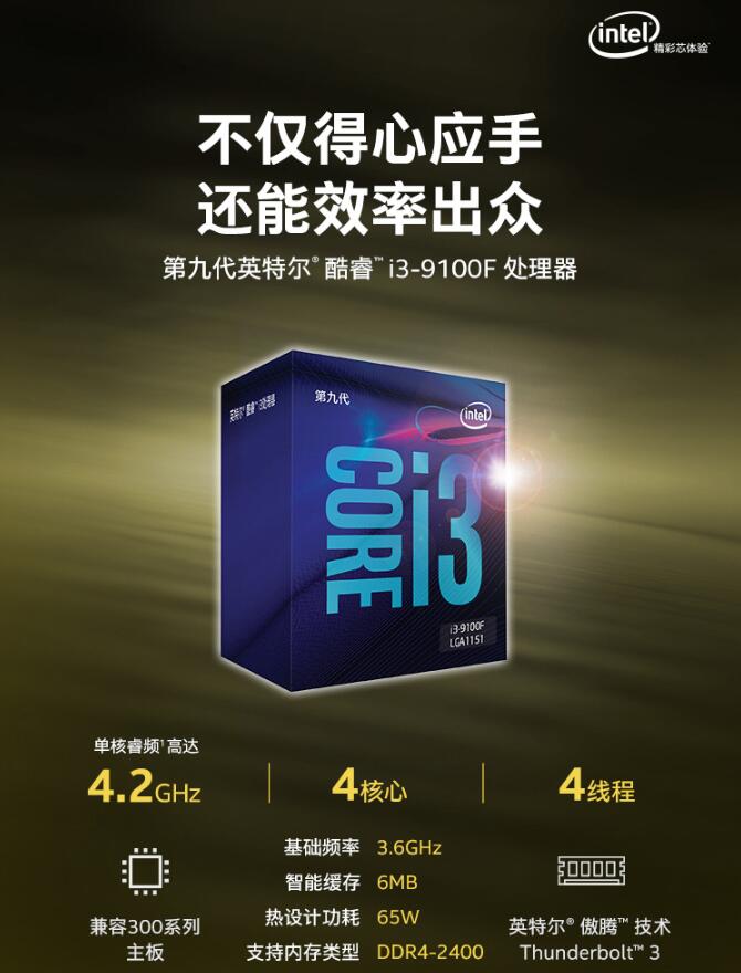 作為入門(mén)級(jí)的9代酷睿處理器,i3-9100F是不錯(cuò)的選擇,這款處理器配備4核4線(xiàn)程,6MB緩存,基礎(chǔ)頻率3.6GHz,加速頻率提升至4.2GHz,支持DDR4-2400內(nèi)存。