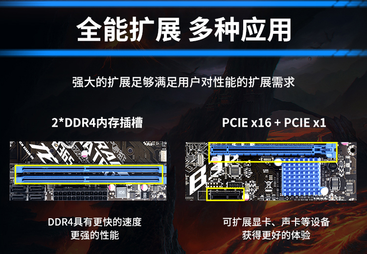 插槽方面,高速雙通道DDR4內(nèi)存插槽和PCIE x16 + PCIE x1插槽,大大增加了后續(xù)的升級(jí)和可擴(kuò)展性,滿(mǎn)足不同玩家的需求。