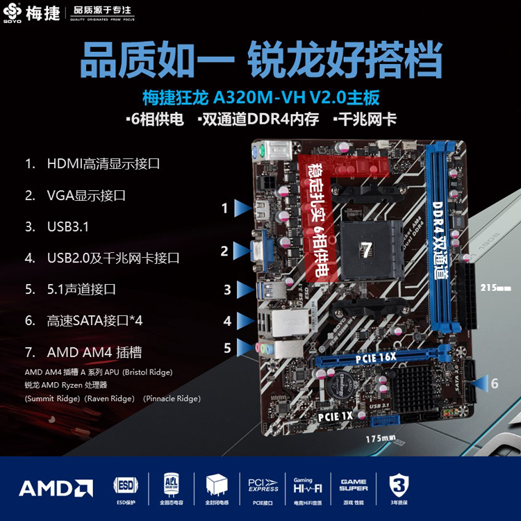 - 1顯卡插槽,2條DDR4內(nèi)存槽,六相供電